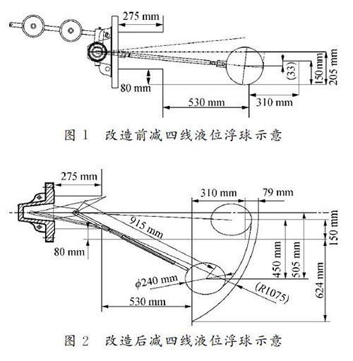 針對減四線液位測量進行大轉角、切割集油箱改造,有效量程大于設計量程的80%,其改造測繪圖如圖2所示。改造后,安裝支架120 mm,插入深度為1 155mm,實際測量液位達450mm,儀表接液部位全部選用317材質。轉軸—杠桿套筒、杠桿套筒—連桿、浮球—連桿的固定連接節(jié)點及加工焊接坡口增加焊接強度;對于活動節(jié)點,采用專用銷子固定。
