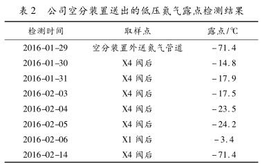 2016年2月14日在X4閥處檢測氮氣的露點為-71.4℃,與空分裝置外送氮氣的露點一樣,表明低壓氮氣管網(wǎng)中的水已經(jīng)完全排出。