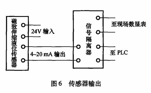 MTS的磁致伸縮式液位儀為法蘭安裝,貯罐罐頂已留有預留孔。安裝時,調試過程簡單,只需通過調試測量頭上的智能型儀表,標定上、下限液位數據后即可。輸出的標準信號4 ~ 20mA通過隔離光柵直接與PLC的模數轉換模塊相連。