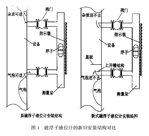 圖1高溫型磁翻板液位計的新舊安裝結構對比氣相總是要向上方或斜上方運動,這樣,氣相就不能置換掉下部接管中的液相,也就不能進人液位計測量室,就避免了氣泡對測量的干擾以及“亂磁”現象的產生。