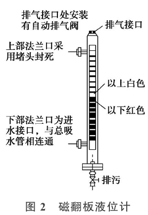 三、磁浮球液位計替換壓力變送器的技改針對壓力變送器測量尾水管水位時,測量值產生誤差的缺陷,對壓力變送器的動作條件以及現場的實際情況進行了初步分析,認為利用連通器的原理,在總吸水管上面安裝一套浮子式的水位開關,這樣既能直觀地反映實時水位,又能保證水泵的安全、可靠運行,浮子開關的位置可以根據實際的工作水位進行布置,利用浮子的開關量去控制水泵的正常啟停。經查找多方面的資料以及咨詢相關設備的廠家后,決定對檢修排水系統增加一套水位測量裝置,具體方案為:在水泵的總吸水管上面安裝一套磁浮球液位計,如圖2所示。