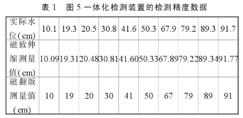 我們把圖5所示的一體化檢測裝置進行了水位檢測實驗,其檢測結果與實際水位值見表1。