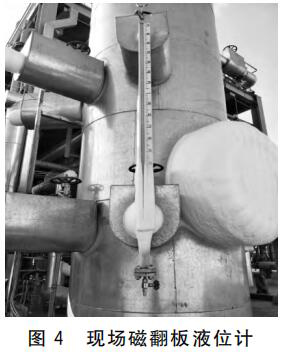現場磁翻板液位計(圖4)由于儲罐壓力偏高,正常生產時為3MPa,導致磁翻版液位計浮子被壓扁。解決方法:尋找能夠生產耐高壓低密度液位計浮子廠家。