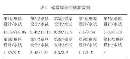 根據GB50341-2014《立式圓筒形鋼制焊接油罐設計規范》中的規定,儲罐內徑小于60m,采取的是定設計點發進行核算[3],核算出的儲罐的每層罐壁的所需厚度(mm)(設計與試水條件下)見表2。