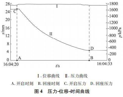 運用安全閥冷態試驗裝置對該凝結水液位計進行動作性能試驗,將試驗容器內的介質壓力卸放到整定壓力以下,開啟試驗容器和安全閥進口端的球閥,關閉流量計管路閥門,開啟主測試管路截止閥,開啟儲氣容器通向試驗容器的節流閥,逐漸加壓,同時啟動計算機數據采集系統,被試安全閥開啟,繼續升高壓力,直至被試安全閥保持全開啟( 排放) 狀態,然后關閉儲氣容器通向試驗容器的閥門,被試安全閥亦逐漸關閉。計算機自動生成試驗過程的壓力、位移曲線,試驗人員記錄采集開啟壓力、排放壓力、回座壓力、開啟高度等數據。重復上述試驗至少 3 次,得到相應壓力-位移-時間曲線,見圖 4。左縱坐標為位置,右縱坐標為壓力,其中上部曲線代表導閥位移,下部曲線代表壓力變化。當導閥位置發生變化,代表導閥開始開啟動作,此時的壓力為該凝結水液位計的開啟壓力,即整定壓力; 當導閥位置回到原點代表導閥已經回座,此時對應的壓力即為回座壓力。