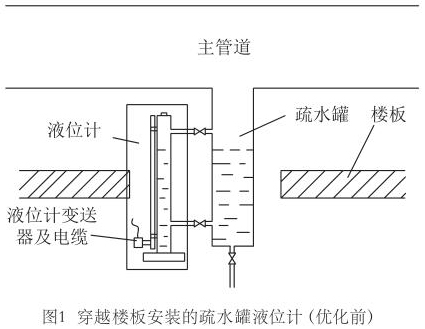 田灣核電3#、4#機組現場疏水罐液位測量*先采用兩個連通管把液位計測量筒與疏水罐連通,測量筒內部含有磁浮子,磁浮子高度隨疏水罐內液位變化,測量筒外部安裝測量桿,感受磁浮子高度,再通過下部變送器轉化成電流信號輸出到DCS系統。一些蒸汽管道安裝布置貼近地面,疏水罐穿越樓板,這樣就使液位計安裝后變送器位于樓板下部,即下一層廠房的房頂;如圖1所示。