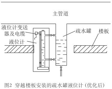 液位計測量桿反向安裝后,變送器和接線盒位于樓板上部,反裝后示意圖如圖2所示。維護時變送器位于接近地面的位置,易于到達,不存在高處作業風險,不需要搭建腳手架,工作流程也能得到簡化。