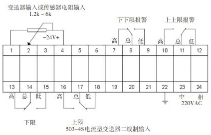 報警控制:面板有上限(H)、上上限(HH)或下限(L)、下下限(LL)報警燈及對應的輸出繼電器。當顯示值高于或低于用戶設定的上限、上上限或下限、下下限值時,對應的報警燈閃爍顯示,且對應的繼電器接點狀態改變,同時伴有表內蜂鳴器報警聲響。