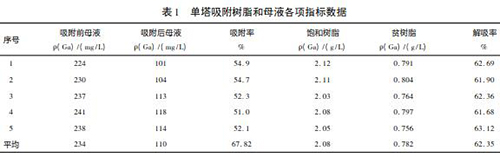(1) 技改原理: 新樹脂入廠檢驗(yàn),飽和樹脂容量可以達(dá)到 2. 5 ~ 2. 8g /L。但在實(shí)際生產(chǎn)中由于含液位計(jì)母液的通過量不足,造成樹脂的吸附率較低,新樹脂飽和樹脂容量一般在 2. 0 ~ 2. 2g /L 之間。通過再增加一組吸附塔來進(jìn)行雙塔吸附,即提高了樹脂利用率,又充分利用了母液,提高樹脂的飽和度。采用雙塔交叉吸附工藝的升級改造,是在原有單塔吸附的基礎(chǔ)上增加一個(gè)吸附塔和一臺(tái)母液進(jìn)塔泵。兩臺(tái)母液進(jìn)塔泵分別向兩個(gè)吸附塔同時(shí)供液樹脂吸附飽和后,兩個(gè)吸附塔樹脂交叉進(jìn)行下步解吸工藝。表 1為單塔吸附工藝生產(chǎn)中取用的一組數(shù)。