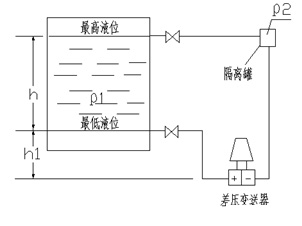 壓力式液位計采用靜壓測量原理,當液位變送器投入到被測液體中某一深度時,傳感器迎液面受到的壓力的同時,通過導氣不銹鋼將液體的壓力引入到傳感器的正壓腔,再將液面上的大氣壓 Po 與傳感器的負壓腔相連,以抵消傳感器背面的 Po ,使傳感器測得壓力為:ρ.g.H ,通過測取壓力 P,可以得到液位深度。