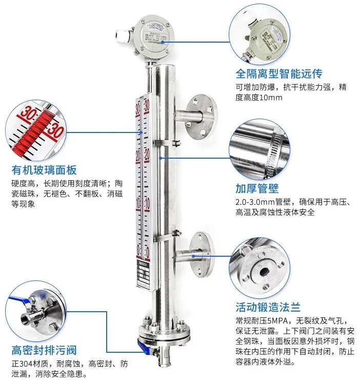 磁性液位計是根據連通器和帶磁藕合基本原理而工作中的。做為一種普遍的液位儀檢測儀表,被普遍用于石油化工設備、倉儲物流運送等制造行業對各種各樣儲槽、儲罐、球形器皿和加熱爐等機器設備內的物質開展液位儀檢驗。相關磁性液位計的基本原理,大家都廣為人知,但對其構造和特性卻了解很少。那麼,磁性液位計的構造構成和特性有什么呢?