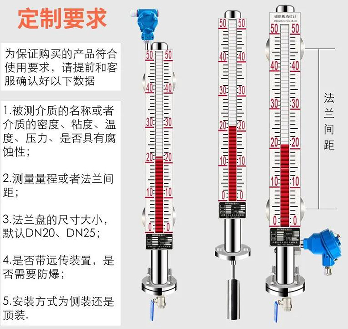 選擇磁性液位計時,知道要測量的介質及為關鍵,像低溫,高溫,腐蝕都是磁翻板致命的因素,如果不清楚介質就隨意選用,不僅會對測量精度有所誤差,也會直接影響磁性液位計的使用壽命;又或者是直接無法使用工況的測量。