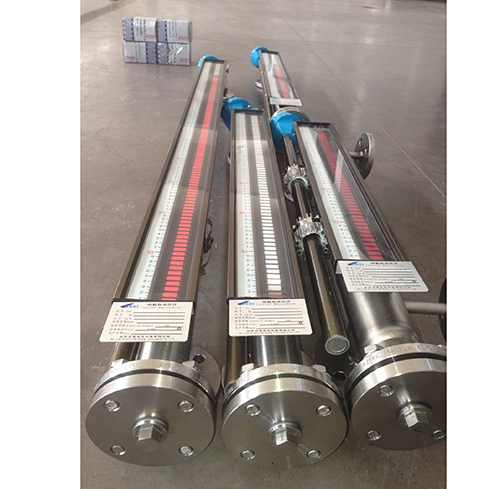 液位計根據浮力原理,浮子在測量管內隨液位的升降而上下移動,浮子內的永久磁鋼通過磁耦合作用,驅動紅、白色翻柱翻轉180’液位上升時,翻柱由白色轉為紅色,下降時,翻柱由紅色轉為白色,從而實現液位的指示。