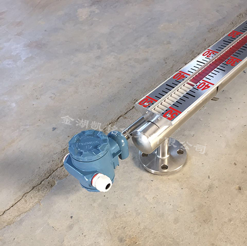 在管體的另一側可按用戶需要加裝電遠傳變送器,將液位高度轉換成標準電流信號輸出,以供液位信號輸出,以供液位信號遠傳至二次儀表進行指示控制與檢測。
